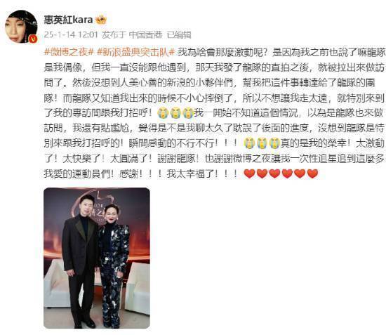 “我一开始不知道这个情况,以为是龙队也来做访问,我还有点尴尬,觉得是不是我聊太久了耽误了后面的进度,没想到龙队是特别来跟我打招呼的!瞬间感动得不行不行!!!真的是我的荣幸!太激动了!太快乐了!太圆满了!谢谢龙队!也谢谢微博之夜让我一次性追星追到这么多我爱的运动员们!感谢!!!我太幸福了!!!”